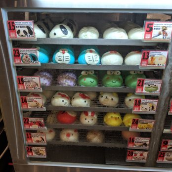 Colorful Chinese dim sum in the style of cartoon characters, often filled with red bean past and matcha. These buns are a great snack in Chinatown.