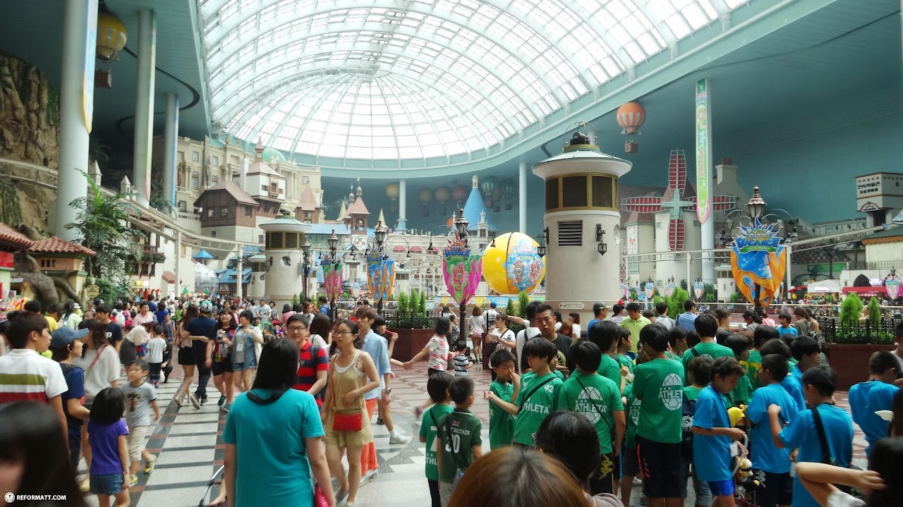 It consists of the world's largest indoor theme park (a Guinness World Record) which is open all year around, an outdoor amusement park called "Magic Island", an artificial island inside a lake linked by monorail, shopping malls, a luxury hotel, a Korean folk museum, sports facilities, and movie theaters.