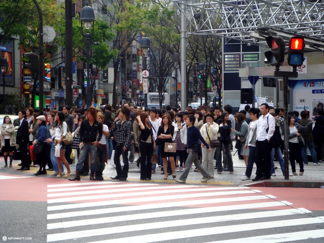 Shibuya is known for its popular scrambled crossing. It is located in front of the Shibuya Station and stops vehicles in all directions to allow pedestrians to inundate the entire intersection. Three massive LCD screens mounted on closeby buildings overlook the crossing.
